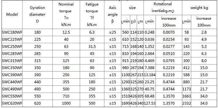 Features and application of SWC-WF universal coupling: connecting shaft drive of two different axes, can not buffer and reduce vibration, adopting integral fork head structure, bearing fixing without bolts, avoiding loose bolt breakage and easy maintenance. It has long service life, high reliability, large bearing capacity and large inclination. It can work under the condition of β≤5°~25°. Suitable for rolling machinery, lifting and transportation, construction machinery, petroleum machinery and other heavy machinery Machinery, in order to meet different installation types, there are seven types of structure: BH type - standard telescopic welding type; BF type - standard telescopic flange type; DH type--short telescopic welding type; CH type - long telescopic welding type; WH type - no telescopic welding type; WF type - no telescopic flange type; WD type - no telescopic short type; ![]() ![]() |