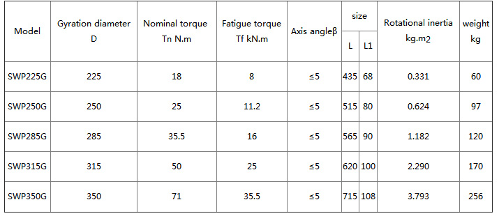 SWP-G universal joint coupling Features and applications: Bearings are wearing parts. In order to facilitate the replacement of the bearing, the bearing seat gland is made into a split type, bolted, and can work under the condition of β≤5°~10°. Applicable to rolling machinery, lifting and transportation machinery, engineering machinery, mining machinery, petroleum machinery and other heavy machinery, connecting two different axes of shaft drive, can not buffer, reduce vibration. Type A - has a telescopic length; Type B - has a telescopic short type; Type C - no telescopic short type; D type - no telescopic long type; E type - has a telescopic double flange length; F type - large telescopic long type; ZG type - dressing through type FG type--reverse through type ![]() ![]() |