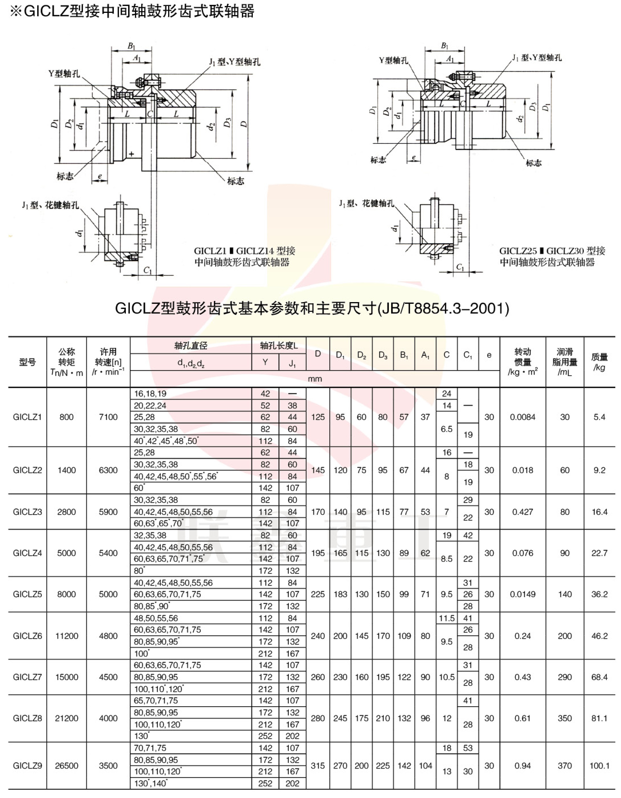 GICLZ型鼓形齿式联轴器 特点及应用场合:具有少量轴线偏移补偿性能,不能缓冲、减振。外形尺寸小,理论上传递转矩大,需要润滑、密封,但噪声较大、价格贵,用于联接水平两同轴线轴系传动。用于低速、重载工况条件下联接水平两同轴线,如冶金机械、重型机械等。不适用于高速、高精度的轴系传动,起动频繁、正反转多变的工况不宜采用。