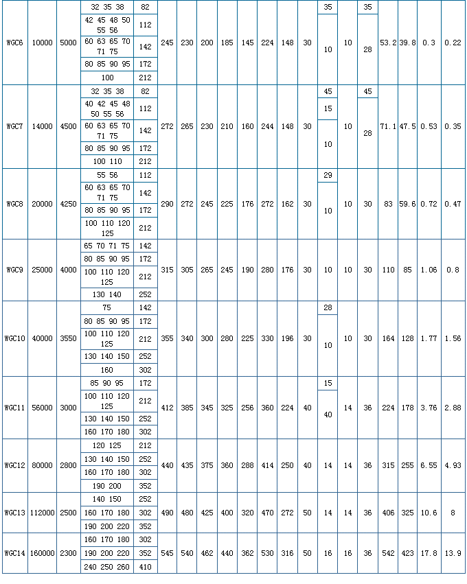 WGT型--接中间套型,适用于两轴长距离联接,许用转速[n]取决于中间套的长度和质量,并应验算临界转速;