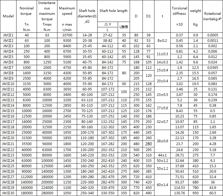 Characteristics and application of JMII diaphragm coupling: Compared with flexible coupling of metal elastic component, it has high mechanical strength, large bearing capacity, light weight, small size, high transmission efficiency and high transmission accuracy, and good reliability. Easy to assemble and disassemble. Suitable for medium, high speed and large torque shaft drive. Compared with the drum-shaped gear coupling, it has no relative sliding, no lubrication, long service life, no noise, simple structure and so on. It can partially replace the drum-shaped toothed auxiliary device. Not affected by temperature and oil. It has the characteristics of acid resistance, alkali resistance and corrosion resistance. It can be used in high temperature, low temperature and working conditions with oil, water and corrosive media. It is suitable for shafting transmission with little change in load of various mechanical devices. It is extremely versatile and has been widely used in industrialized countries. It is a high-performance flexible coupling 重点 which is mainly promoted and applied in China. High-precision diaphragm coupling can be used for High speed conditions. Compared with the toothed coupling, the diaphragm coupling has no relative sliding, no lubrication, no sealing, no noise, no maintenance, and is convenient to manufacture. It can partially replace the gear coupling. The diaphragm coupling has been widely used in industrialized countries in the world. In practical applications, the intermediate shaft type is generally adopted to improve the offset compensation performance of the two axes. JMI type - basic type with countersink; JMIJ type--with countersunk and intermediate shaft type; JMII type - no counterbore basic type; JMIIJ type - no countersinking intermediate shaft type; ![]() ![]() |