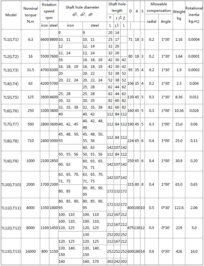TL (LT) type elastic sleeve pin coupling characteristics and application: it has a certain compensation for the relative offset of the two axes and damping, buffering performance, simple structure, easy to manufacture, no lubrication, convenient maintenance, large radial size It is suitable for the shaft of the installation base with good rigidity, high precision of alignment, small impact load and low requirements for vibration reduction. It has wide application range and is the earliest universal standard coupling in China. Not suitable for high speed and low speed heavy duty conditions. TL (LT) type - basic type; TLL (LTZ) type - with brake wheel type ![]() ![]() |