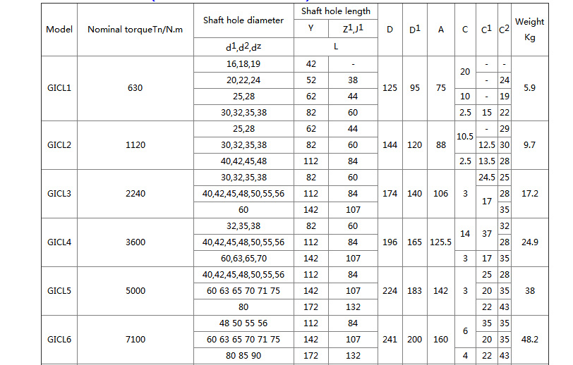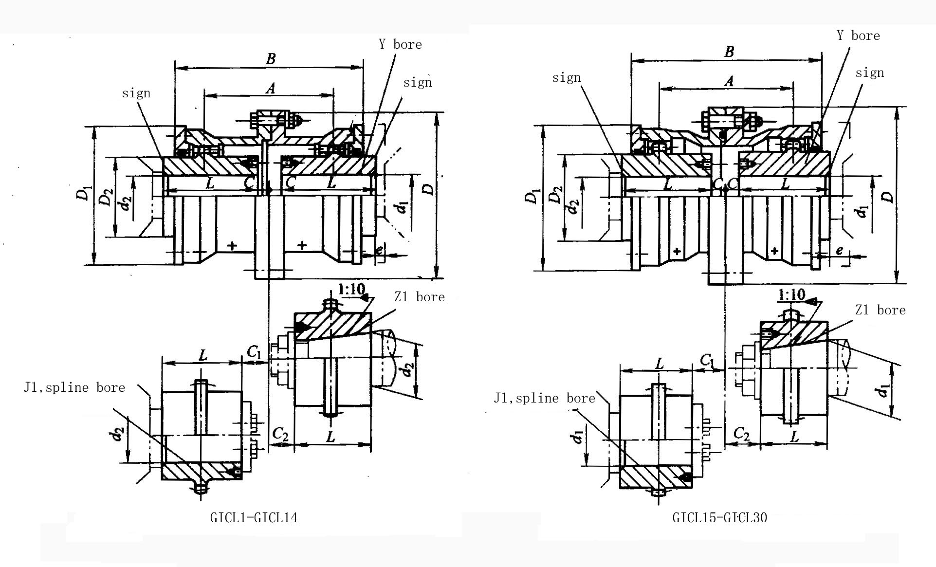 Features and applications: With a small amount of axis offset compensation performance, can not buffer, reduce vibration. The outer shape is small, the theoretical transmission torque is large, and lubrication and sealing are required. When the precision is low, the noise is large, the processability is poor, and the price is expensive. When the elastic coupling can be replaced, the gear coupling should be avoided as much as possible for connecting the horizontal two coaxial shaft drive. It is used to connect two horizontal coaxial lines under low speed and heavy load conditions, such as metallurgical machinery and heavy machinery. When the accuracy is low, it is not suitable for high-speed, high-precision shafting transmission. It is not suitable to use frequent starting and reverse rotation. GICL type - basic type (wide type); GIICL type - basic type (narrow type); GICLZ type - intermediate shaft type (wide type); GIICLZ type - intermediate shaft type (narrow type); GICL, GIICL type, for direct connection between two shaft ends; GICLZ, GILZ type, for two-axis long-distance connection; GCLD type--motor shaft extension type, used for motor shaft extension connection; ![]() ![]() ![]() ![]() |