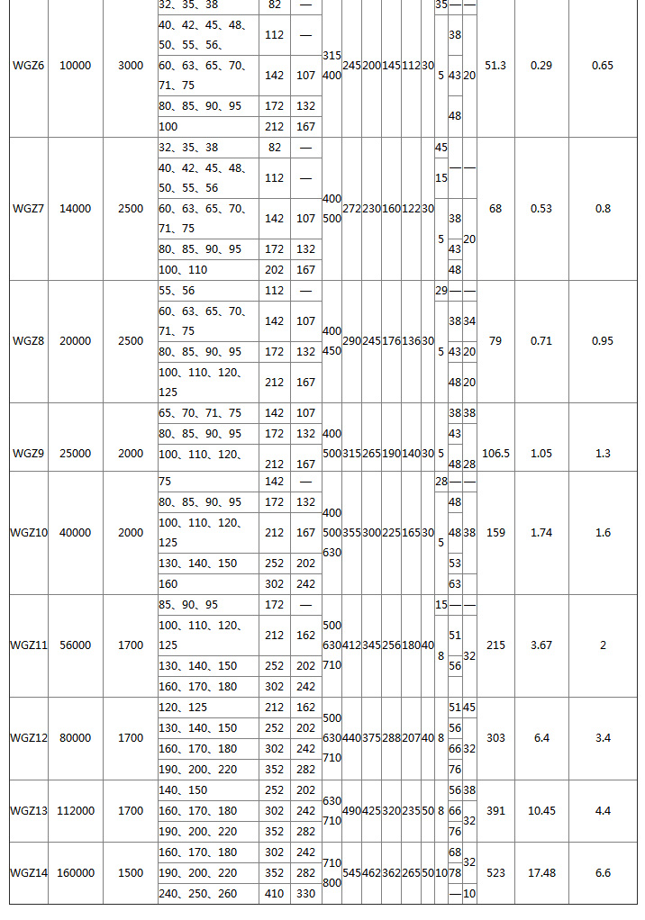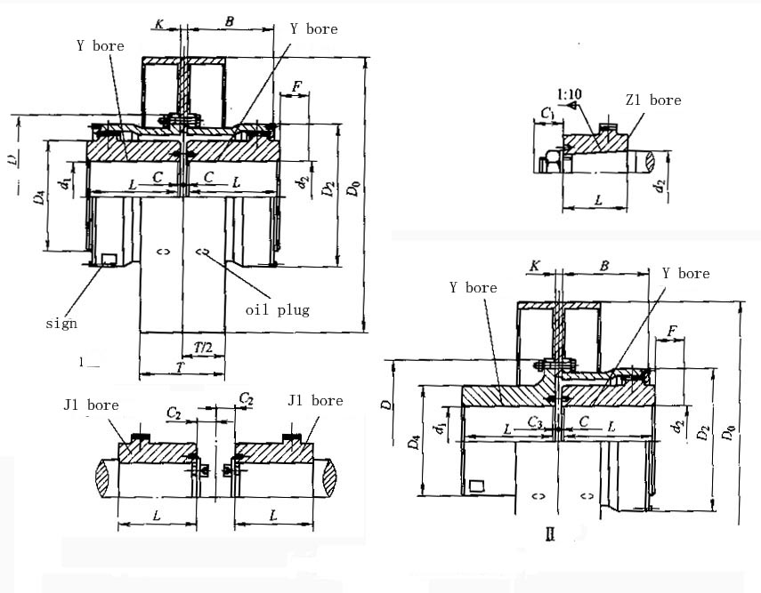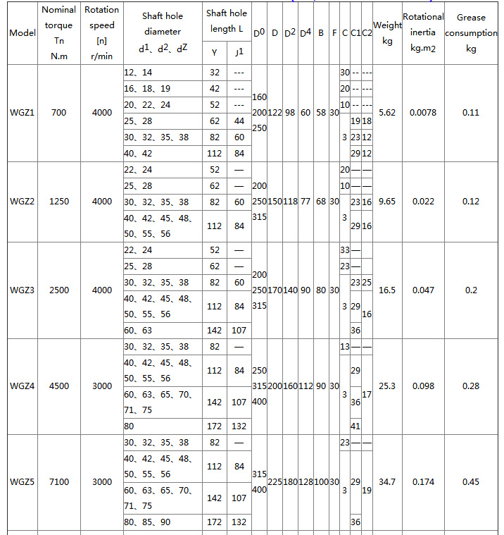 WGZ drum gear coupling Features and applications: With a small amount of axis offset compensation performance, can not buffer, reduce vibration. The outer shape is small, theoretically, the transmission torque is large, and it needs lubrication and sealing, but the noise is large and the price is expensive, and it is used for connecting the horizontal two coaxial line shaft transmission. It is used to connect two horizontal coaxial lines under low speed and heavy load conditions, such as metallurgical machinery and heavy machinery. It is not suitable for high-speed, high-precision shafting transmission. It is not suitable to use frequent starting and reverse rotation. WG type - basic type; WGP type - with brake disc type, suitable for matching with disc brakes; WGZ type - with brake wheel type, suitable for supporting with tile brakes; WGT type - connected to the middle sleeve type, suitable for two-axis long-distance connection, the allowable speed [n] depends on the length and quality of the intermediate sleeve, and the critical speed should be checked; WGC type - vertical installation type, used to connect vertical two-axis shaft drive; Type I--The sealed end cap is of separate type with large tooth spacing, which can allow large radial displacement and can be connected with Y, J1 and Z1 shaft extensions; Type II--The sealed end cover is integral, the tooth spacing is small, the relative radial displacement is relatively small, the structure is compact, the moment of inertia is small, and it can be connected with the Y and J1 type shaft extension; ![]() ![]() |