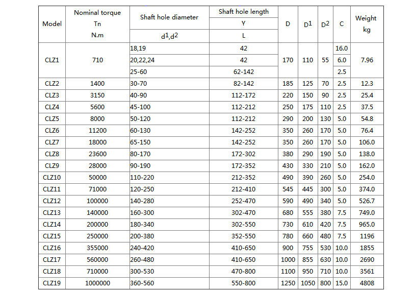 Features and applications: With a small amount of axis offset compensation performance, can not buffer, reduce vibration. The outer shape is small, theoretically, the transmission torque is large, and it needs lubrication and sealing, but the noise is large and the price is expensive, and it is used for connecting the horizontal two coaxial line shaft transmission. It is used to connect two horizontal coaxial lines under low speed and heavy load conditions, such as metallurgical machinery and heavy machinery. CL and CLZ type are spur gear type, which is used for low speed and heavy load. The two horizontal shafts are connected. The straight tooth type compensation performance is poor. It is a eliminated type and has been replaced by drum type gear. It should not be used again.