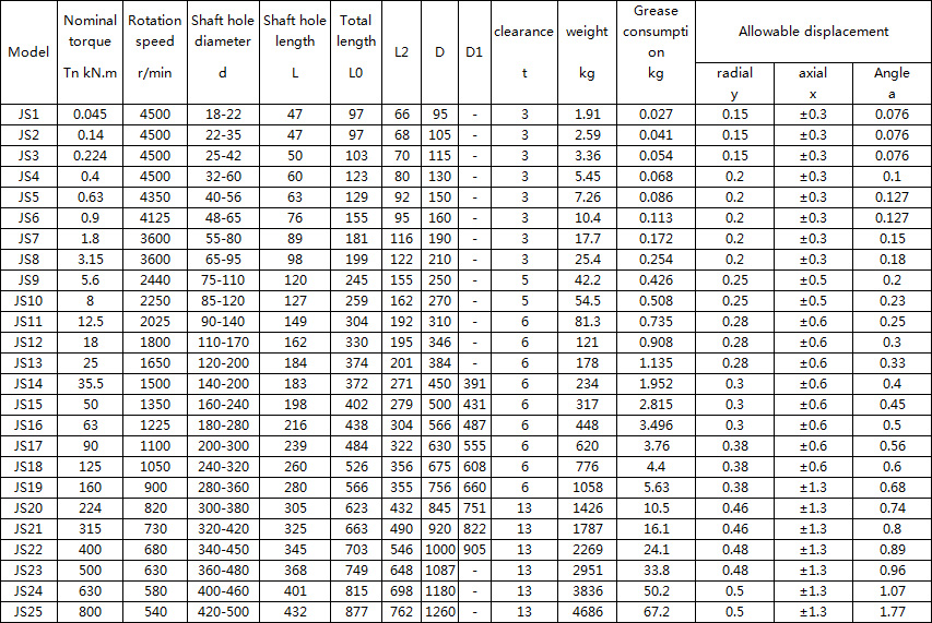 6. Allows for large installation deviation Since the spring piece is in point contact with the toothed surface, the coupling can be made more flexible. It can be installed in normal operation with radial, angular and axial deviations. The specific installation deviation values are shown in the other table.