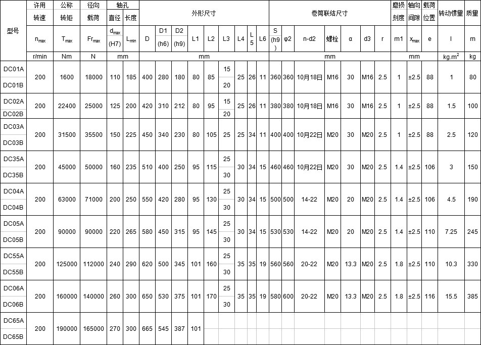 DC系列卷筒用鼓形齿式联轴器主要参数及尺寸: mm