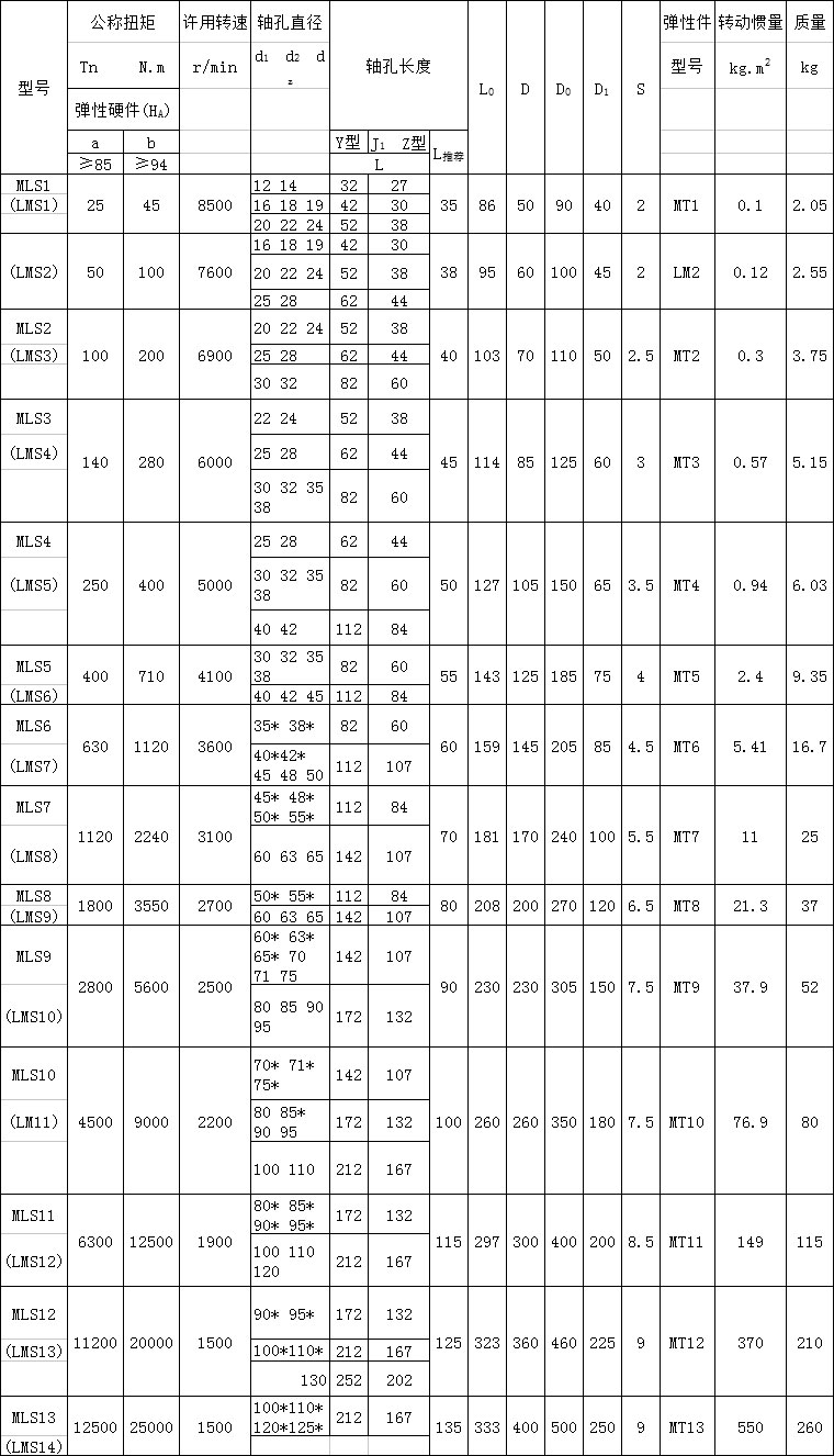 MLS 型梅花形弹性联轴器基本参数和主要尺寸(GB/T5272-2002)mm ![]() |