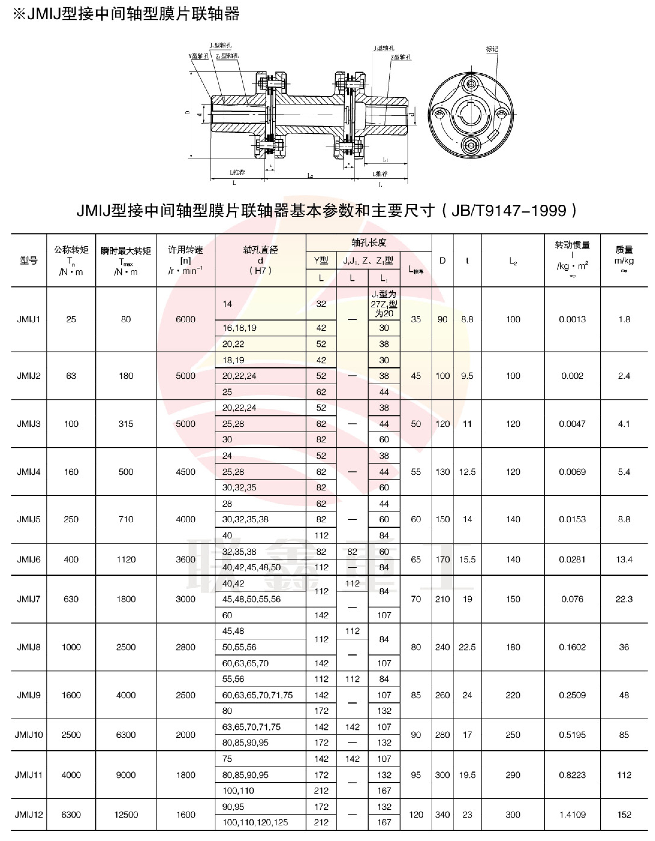 JMIJ膜片联轴器 特点及应用场合:与金属弹性元件挠性联轴器相比,具有机械强度高,承载能力大、质量轻结构尺寸小、传动效率和传动精度高,可靠性好、装拆方便等特点。适用于中、高速、大转矩轴系传动。与鼓形齿式联轴器相比,具有无相对滑动,不需润滑,使用寿命长、无噪声、结构简单等特点.可部分代替鼓形齿式联辅器。不受温度和油污影响。具有耐酸、碱,防腐蚀的特点。可用于高温、低温和有油、有水和腐蚀介质的工况环境.适用于各种机械装置载荷变化不大的轴系传动,通用性极强,工业发达国家已普遍采用,是我国重点推广应用的高性能挠性联轴嚣,高精度膜片联轴器可用于高速工况。膜片联轴器与齿式联轴器相比,没有相对滑动,不需要润滑、密封,无噪声,基本不用维修,制造较方便,可部分代替齿式联轴器。膜片联轴器在工业发达国家应用已很普遍,在实际应用中一般采用接中间轴型,以提高两轴线偏移补偿性能。