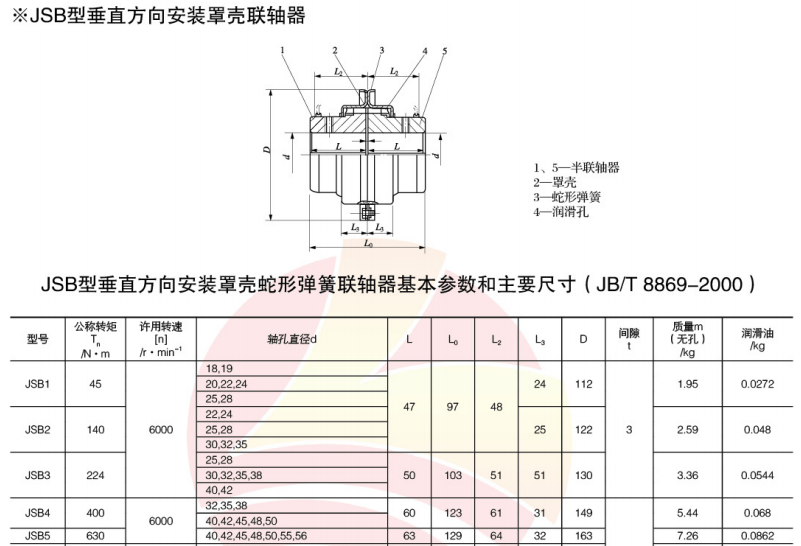 JSB型蛇形簧联轴器简称“蛇簧联轴器”按JB/T 8869-2000标准制作,与JS型蛇形簧联轴器不同的是JS型蛇形簧联轴器用于水平方向安装而JSB型蛇形簧联轴器用于垂直方向安装。