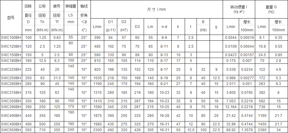 SWC-BH型万向联轴器 特点及应用场合:联接两个不同轴线的轴系传动,不能缓冲、减振,采用整体叉头结构,轴承固定不用螺栓,避免了螺栓松动断裂,便于维修,延长使用寿命,可靠性高,承载能力大、倾角大,可在β≤5°~25°工况下工作。适用于轧钢机械、起重运输、工程机械、石油机械及其他重型机械,为满足不同安装型式要求,有七种结构型式: