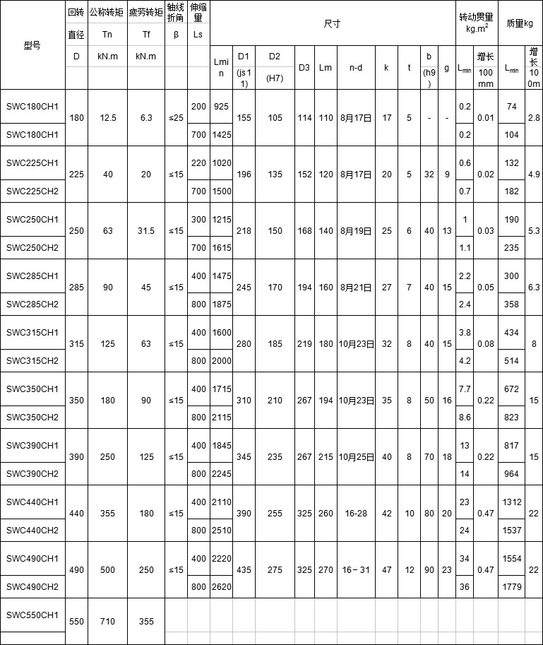 SWC-CH型联轴器 特点及应用场合:联接两个不同轴线的轴系传动,不能缓冲、减振,采用整体叉头结构,轴承固定不用螺栓,避免了螺栓松动断裂,便于维修,延长使用寿命,可靠性高,承载能力大、倾角大,可在β≤5°~25°工况下工作。适用于轧钢机械、起重运输、工程机械、石油机械及其他重型机械,为满足不同安装型式要求,有七种结构型式:
