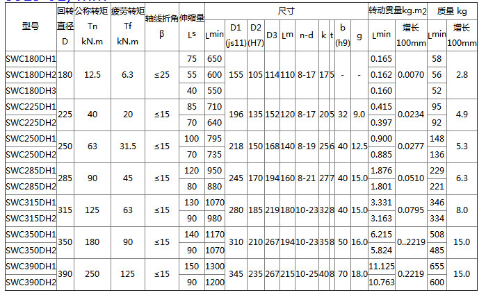 SWC-DH型万向联轴器 特点及应用场合:联接两个不同轴线的轴系传动,不能缓冲、减振,采用整体叉头结构,轴承固定不用螺栓,避免了螺栓松动断裂,便于维修,延长使用寿命,可靠性高,承载能力大、倾角大,可在β≤5°~25°工况下工作。适用于轧钢机械、起重运输、工程机械、石油机械及其他重型机械,为满足不同安装型式要求,有七种结构型式:
